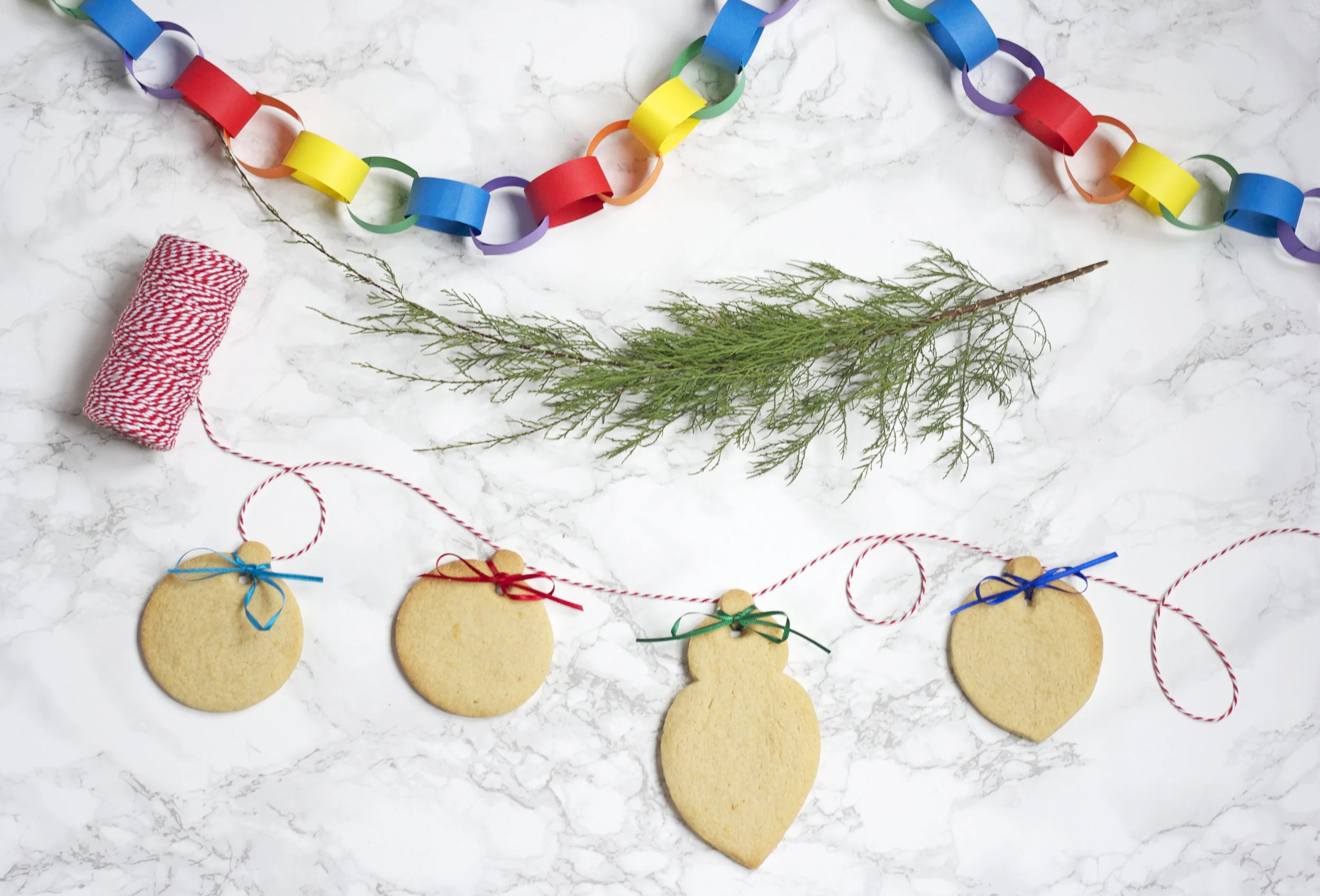 Here I have strung each biscuit with a coloured ribbon to finish - simply make an additional hole in the top of each biscuit before baking using the tip of a large icing nozzle.