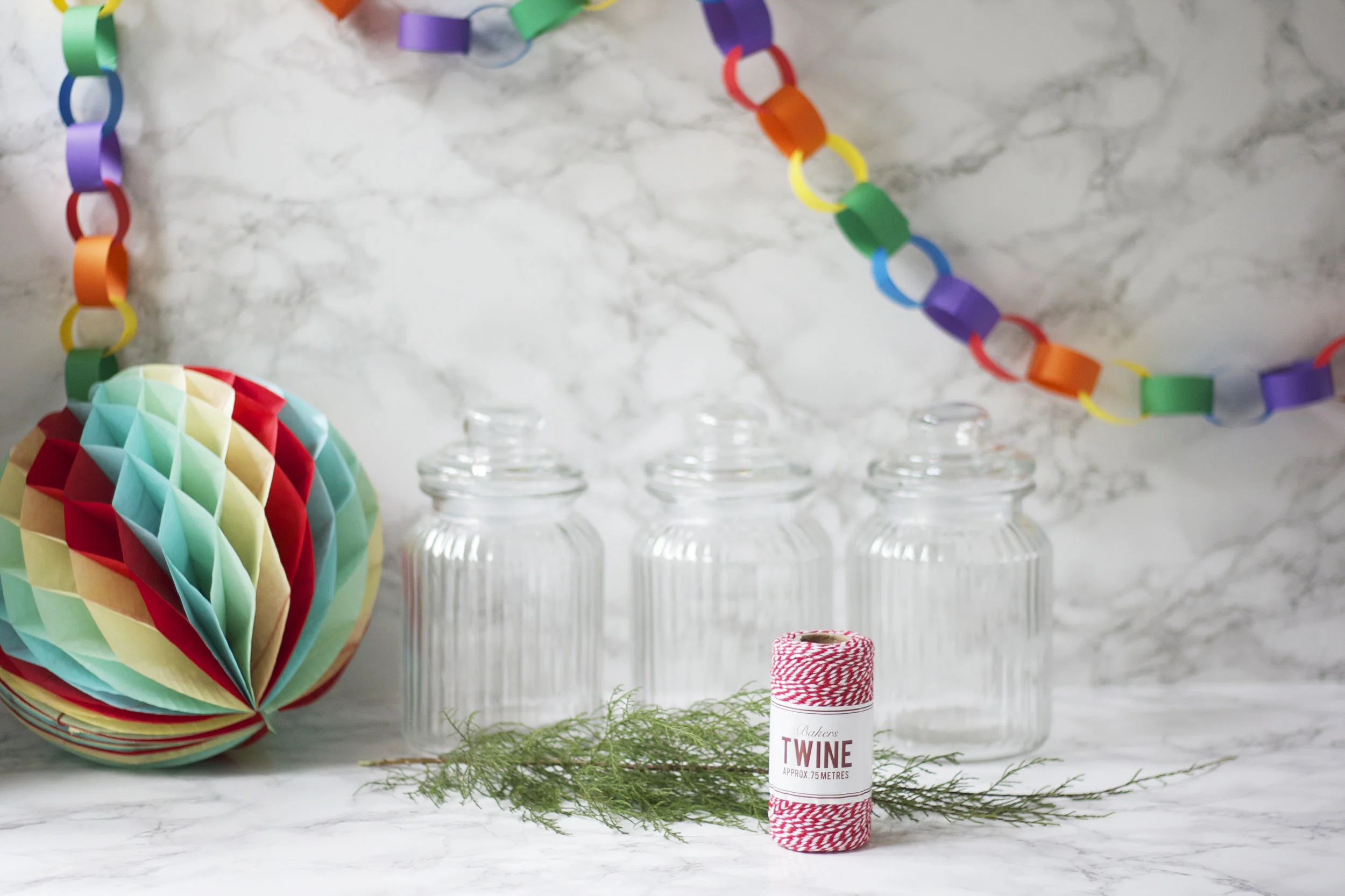 Cerise And White Bakers Twine; Set of 4 Bauble cookie cutters; Medium Traditional Ridged Glass Biscuit Jar; Large Multicolour Party Honeycomb Ball - all from www.dotcomgiftshop.com