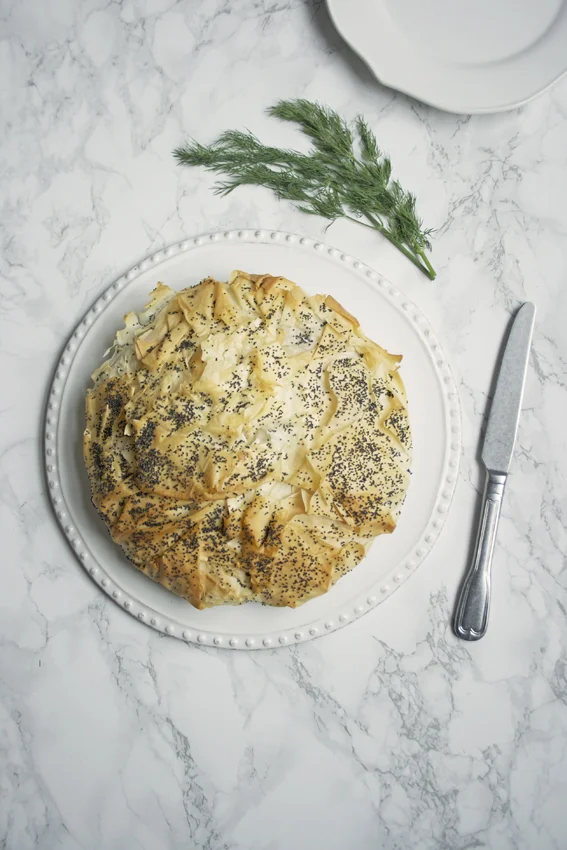 6. Pour the egg and greens mixture into the middle and level out with a spoon. Fold the excess layers of pastry over the top to cover the top of the greens mixture. No need to be too neat here, as some movement and texture looks beautiful. Serve with a simple salad.