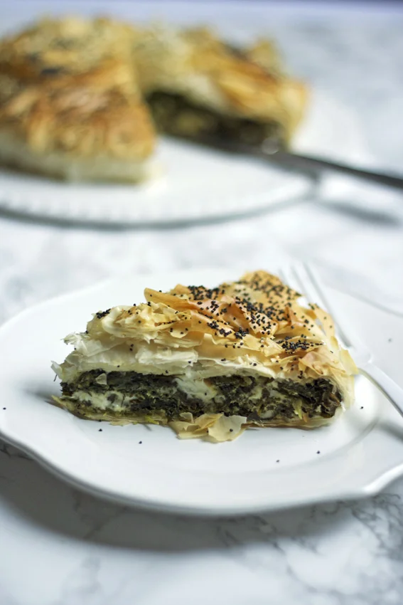 I have no problem with eating my greens - I could probably give Popeye a run for his money. Spinach, Chard, Spring Greens and Kale - I love them all. This simple pie welcomes any of the aforementioned green leaves. Paired with a creamy salty feta cheese and encased in crispy wafer thin sheets of Filo pastry, it's extremely delicious and good for you too.
